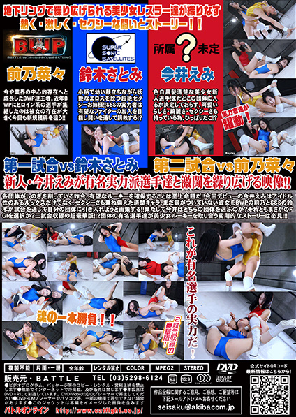 新人・今井えみが有名実力派選手達と激闘を繰り広げる映像!!各団体がしのぎを削っている昨今、有望なルーキーを確保することは至上命題だ!!今回デビューの今井えみはアイドル性のあるルックスだけでなく、セクシーさも兼ね備えた清楚キャラ。まだ癖がついていない彼女をBWPの前乃とSSSの鈴木が試合を通して自分の団体に引き入れようと画策する!!果たして今井はどちらの団体を選ぶのか?それともまさかのFGIを選択か?二試合収録の超豪華版!!2団体の有名選手達が美少女ルーキーを取り合う変則的なストーリーは必見!!!